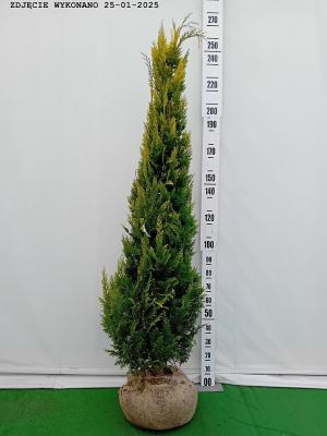 Zimozielony cyprysik o stożkowatym pokroju. Pędy złocistożółte listkowate.