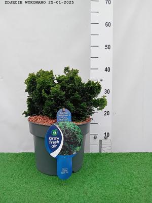 Zimozielony bardzo wolnorosnący cyprysik o szerokostożkowym pokroju. Rozgałęzienia krótkie. błyszczące. ciemnozielone. muszlowato skręcone. Po 10 latach dorasta do 0.5 m wysokości. Szczególnie polecany do małych ogrodów przydomowych i ogrodów japońskich