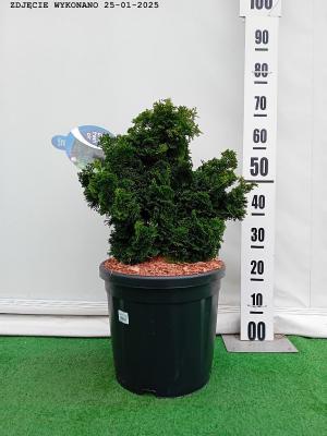 Zimozielony bardzo wolnorosnący cyprysik o szerokostożkowym pokroju. Rozgałęzienia krótkie. błyszczące. ciemnozielone. muszlowato skręcone. Po 10 latach dorasta do 0.5 m wysokości. Szczególnie polecany do małych ogrodów przydomowych i ogrodów japońskich