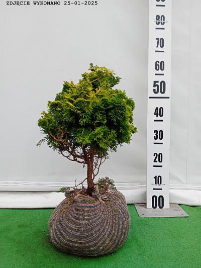 Zimozielony wolnorosnący cyprysik o gęstym. szerokostożkowym pokroju. Rozgałęzienia wachlarzykowate. gęste. ciekawie poukładane na pędach. Ulistnienie łuskowate. jasnożółte. Po 10 latach dorasta do 0.7 m wysokości. Polecany dla kolekcjonerów roślin karło