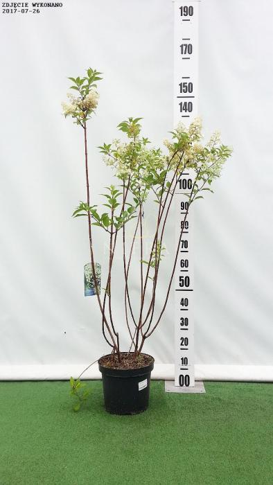 Hortensja bukietowa. ozdobna w zielone. lekko błyszczące liście oraz bardzo duże wysmukłe. stożkowate kwiatostany. Dorasta do 3 m wysokości. Polecana do ogrodów przydomowych i uprawy pojemnikowej.