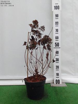 krzew o kwiatach jasnożółtych. później zielonkawych pod koniec kwitnienia brzegi kwiatów przebarwiają się na różowo kwiatostany kuliste