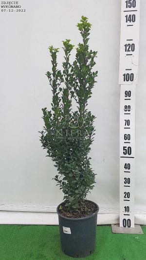 Zimozielony ostrokrzew o szerokim. kolumnowym pokroju i gęstym ugałęzieniu. Ozdobny w ciemnozielone. eliptyczne liście z lekkim niebieskawym odcieniem. drobno ząbkowane. nie kłujące. Dorasta do 2.5 m wysokości. Doskonały na żywopłoty. do sadzenia pojedync