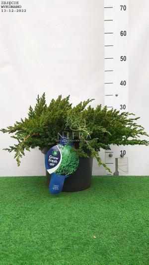Zimozielony. niski i wolnorosnący jałowiec o pełzających pędach. Ozdobny w zielononiebieskie. krótkie igły. Wzrost do 0.2 m wysokości przy 1.5 m średnicy. Plecany na skalniaki. a w formie szczepionej na balkony i tarasy.