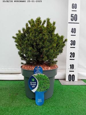 Karłowy świerk biały o kulistym pokroju. Osiąga 0.3 m średnicy po 10 latach. Posiada cienkie pędy i krótkie zielone igły. Polecany na skalniaki i do pojemników.