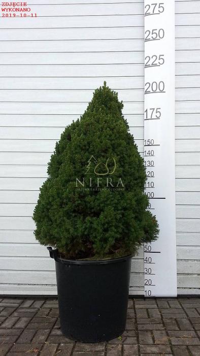 Karłowy świerk biały w formie regularnego i gęstego stożka. Osiąga 1 m wysokości po 10 latach. Posiada cienkie. sztywne pędy i krótkie zielone igły. Polecany na skalniaki. wrzosowiska i do pojemników oraz na cmentarze.