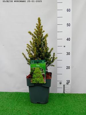 Wolnorosnący świerk biały w formie bardzo regularnego stożka. Osiąga 2.5 m wysokości. Posiada cienkie. sztywne pędy oraz krótkie i miękkie igły. Pierwszy przyrost jest zielony. a drugi żółty. Polecany na skalniaki. wrzosowiska oraz do alpinariów i mniejsz