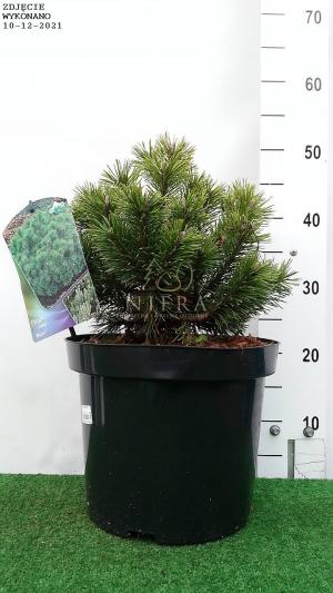 Bardzo wolnorosnąca sosna kosodrzewina o kulistym pokroju. Po 10 latach dorasta do 0.5 m wysokości i szerokości. Posiada zielononiebieskie. ciemne igły. zebrane po dwie. Polecana na skalniaki i wrzosowiska oraz do uprawy pojemnikowej.