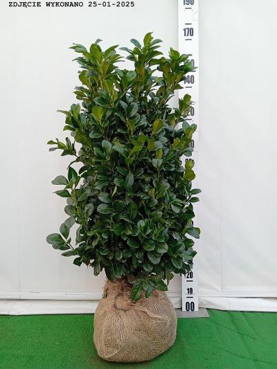 Zimozielona laurowiśnia wschodnia o wzniesionych pędach. Wzrost do 1.5 m wysokości. Posiada ciemnozielone. błyszczące. duże. szerokojajowate liście. Ozdobna w drobne. pachnące. białe kwiaty. zebrane w wyprostowane grona. a następnie małe. kuliste. czarne