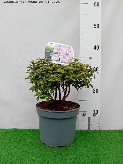 "Zimozielony różanecznik z rodziny wrzosowatych o zwartym pokroju przez cały okres wzrostu. charakteryzujący się ciemnozielonymi. skórzastymi liśćmi. Ozdobą różaneczników są przede wszystkim kwiaty. zebrane w obfite. wielobarwne kwiatostany na szczytach p