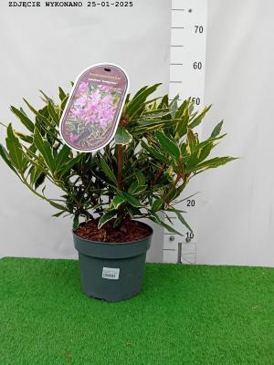"Zimozielony różanecznik pontyjski z rodziny wrzosowatych o zwartym pokroju przez cały okres wzrostu. charakteryzujący się ciemnozielonymi. skórzastymi liśćmi. Ozdobą różaneczników są przede wszystkim kwiaty. zebrane w obfite. wielobarwne kwiatostany na s