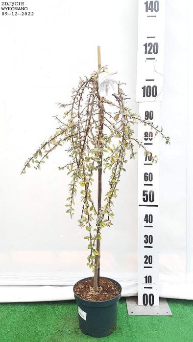 Wolnorosnąca irga z charakterystycznymi kępiastymi wybrzuszeniami. Ozdobna w ciemnozielone z białym rysunkiem liście. z wierzchu błyszczące. od spodu niebieskozielone. kosmato owłosione oraz białe kwiaty i intensywnie pomarańczowoczerwone kuliste owoce. W