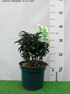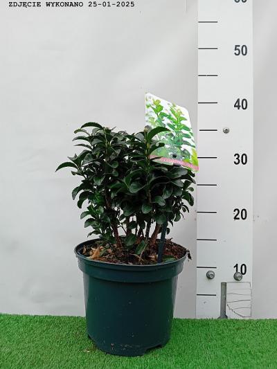 Zimozielona trzmielina ozdobna w ciemnozielone. błyszczące. eliptyczne liście. Wzrost do 1.25 m wysokości i 0.5 m szerokości. Polecana do ogrodów i pojemników. na tarsy. balkony oraz żywopłoty.