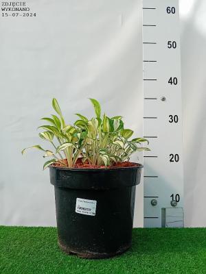 funkia 'Pandora's Box' - liście ciemnozielone z białym paskiem po środku dorasta zaledwie do 15 cm