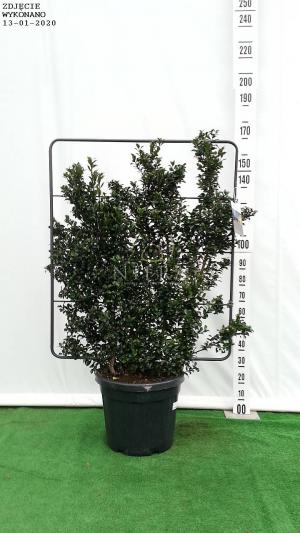 Zimozielony ostrokrzew o szerokim. kolumnowym pokroju i gęstym ugałęzieniu. Ozdobny w ciemnozielone. eliptyczne liście z lekkim niebieskawym odcieniem. drobno ząbkowane. nie kłujące. Dorasta do 2.5 m wysokości. Doskonały na żywopłoty. do sadzenia pojedync