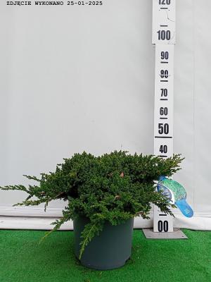 Zimozielony. niski i wolnorosnący jałowiec o pełzających pędach. Ozdobny w zielononiebieskie. krótkie igły. Wzrost do 0.2 m wysokości przy 1.5 m średnicy. Plecany na skalniaki. a w formie szczepionej na balkony i tarasy.