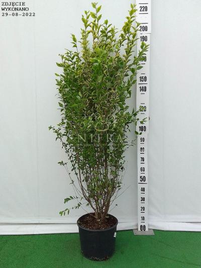 Ligustr o dwubarwnych liściach i wyprostowanych pędach z licznymi bocznymi rozgałęzieniami. Ozdobny w eliptyczne liście. u nasady szerokoklinowate. z wierzchu błyszczące. ciemnozielone z szerokim. żółtym marginesem. od spodu jaśniejsze. żółtawozielone. Kw