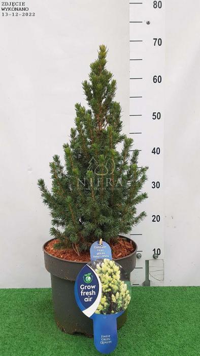Karłowy świerk biały w formie bardzo regularnego i gęstego stożka. Osiąga 1.5-2 m wysokości. Posiada cienkie. sztywne pędy i krótkie zielone igły. Pierwszy przyrost jest żółtobiały. a drugi jest zielony. Polecany na skalniaki. wrzosowiska oraz do alpinari