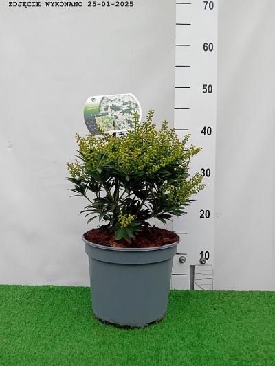 Zimozielony pieris o płaskokulistym. zwartym pokroju. Dorasta po 10 latach do 0.6 m wysokości i 0.9 m szerokości. Ozdobny w matowozielone liście. skierowane ukośnie do góry oraz śnieżnobiałe kwiaty zebrane w wyprostowane. wierzchołkowe wiechy. Szczególnie