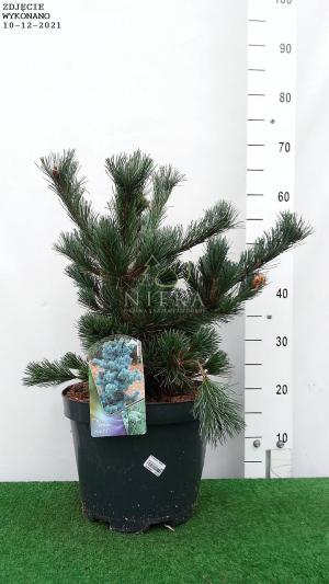 Wolnorosnąca sosna drobnokwiatowa o stożkowatym pokroju. Wzrost 3-5 m wysokości i 2-4 m szerokości. Posiada sztywne. poskręcane. krótkie igły. z wierzchu srebrzystoniebieskie. od spodu z białymi paskami. Dodatkową ozdobą są liczne. skupione po kilka. nie