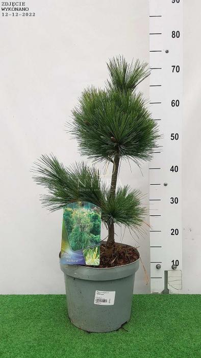 Wolnorosnąca sosna o zwartym. szerokostożkowym pokroju i długich srebrzystoniebieskich igłach. Po 10 latach dorasta do 1.5 m wysokości i 1 m szerokości. Posiada bardzo zagęszczone pędy i miękkie. dwukolorowe. przewieszające się igły. Dodatkową ozdobą są b