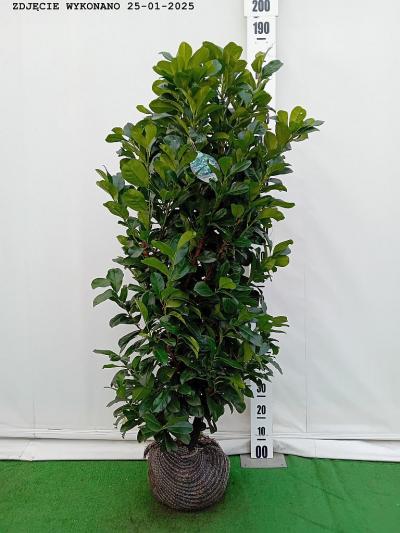 Zimozielona laurowiśnia wschodnia o wzniesionych pędach. Wzrost do 1.5 m wysokości. Posiada ciemnozielone. błyszczące. duże. szerokojajowate liście. Ozdobna w drobne. pachnące. białe kwiaty. zebrane w wyprostowane grona. a następnie małe. kuliste. czarne
