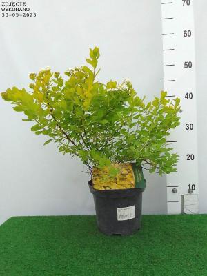 Tawuła brzozolistna o rozłożystym. płaskokulistym pokroju. Wzrost do 0.8 m wysokości i 1 m szerokości. Posiada młode pędy czerwone oraz liście wiosną intensywnie żółte. z delikatnym różowawym odcieniem. później żółtozielone a jesienią żółte. Ozdobna w bia