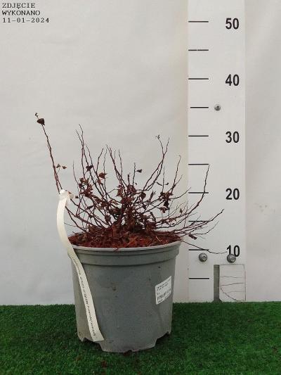 młode przyrosty czerwonawe. liście żółte kwiaty jasnoróżowe obfite kwitnienie pokrój zwarty