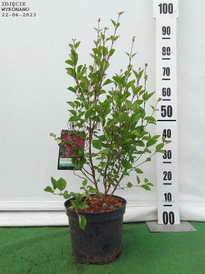 niski. zwarty krzew do 1 m wys. kwiaty w pąkach czerwone. po otwarciu się ciemnoróżowe