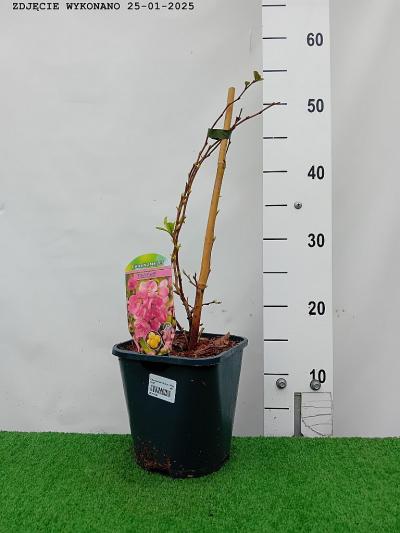 Pigwowiec o rozłożystym gęstym pokroju i pokładających się pędach pokrytych cierniami. Wzrost do 1 m wysokości i 2 m średnicy.