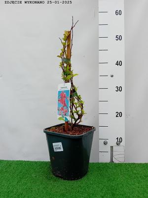 Pigwowiec o rozłożystym gęstym pokroju i pokładających się pędach pokrytych cierniami. Kwiaty łososioworóżowe z żółtymi pręcikami. bardzo liczne. Owoce kuliste. zielone. później żółte. bardzo twarde. doskonałe na przetwory. Liście ciemnozielone. błyszcząc